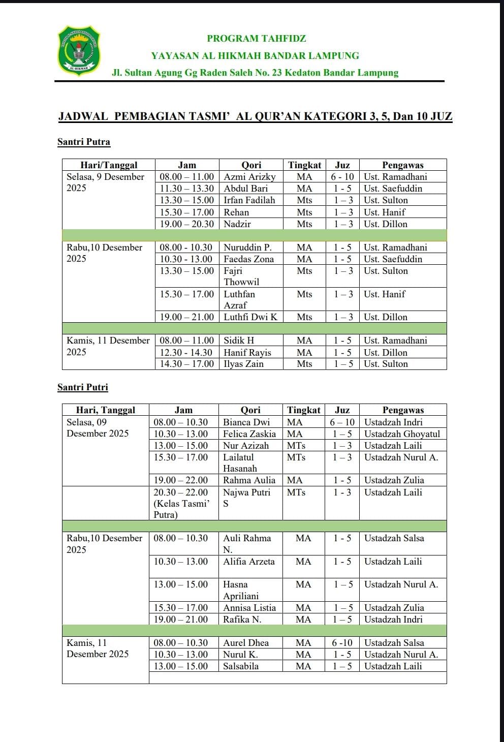 Jadwal Ujian Tasmi' Al Qur'an Santri Tahfidz Al Hikmah